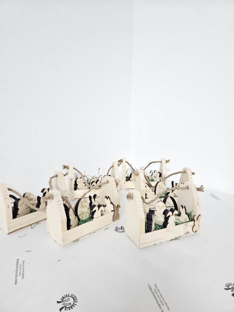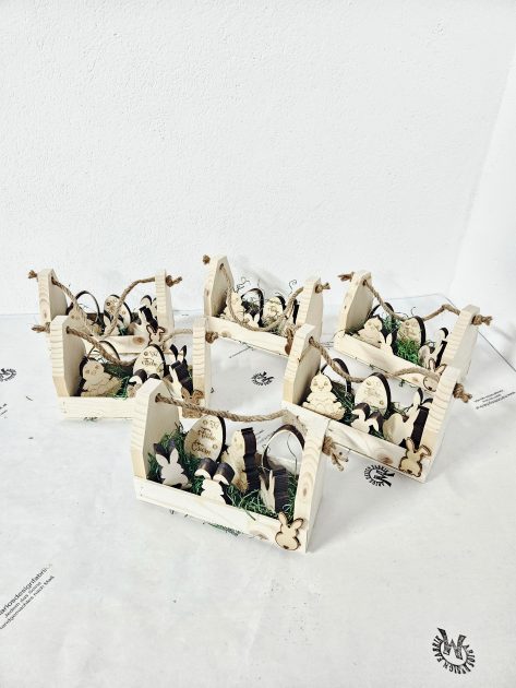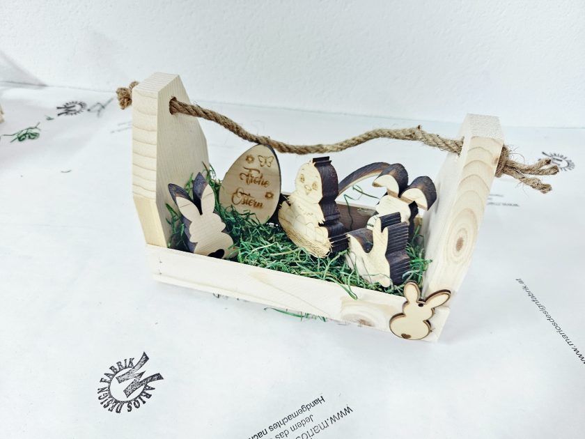 Eine Holzsteige aus Unserer Produktion befüllt mit etwas Ostergras und 6 Osterholz Figuren aus 18mm dickem Fichtenholz.